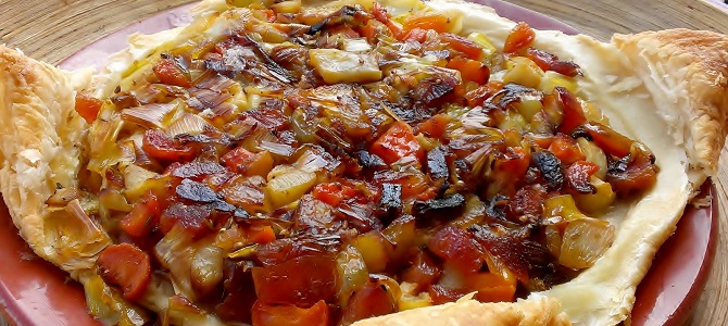 Retire os vegetais do forno e acrescente 3 dentes de alho picados. Cozinhe durante mais 10 minutos. Finalmente, junte 175g de alho francês cortado às rodelas, misture e leve novamente ao forno durante 10 minutos. [Se achar que os vegetais estão a queimar, reduza ligeiramente a temperatura do forno.]